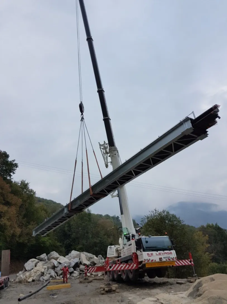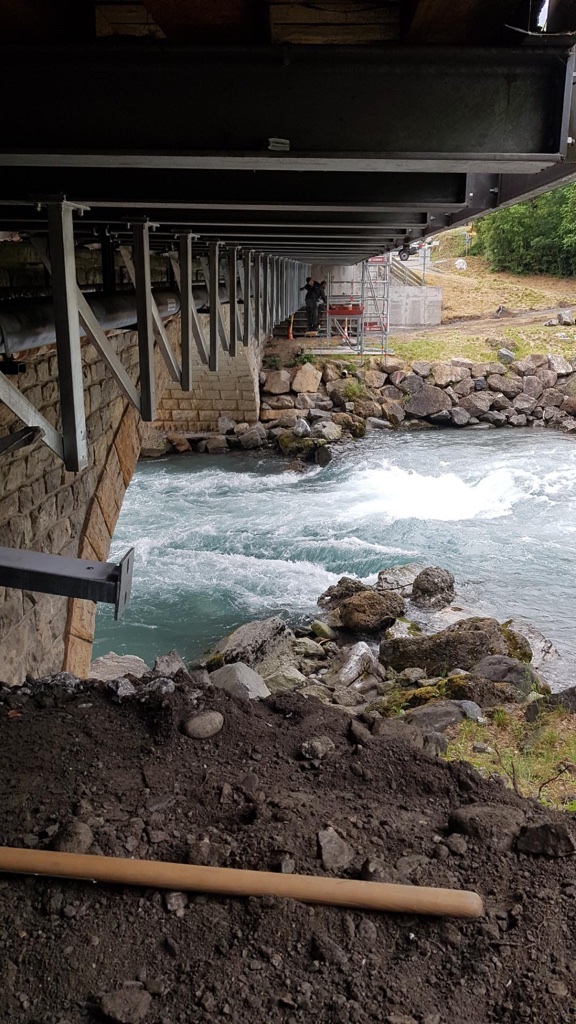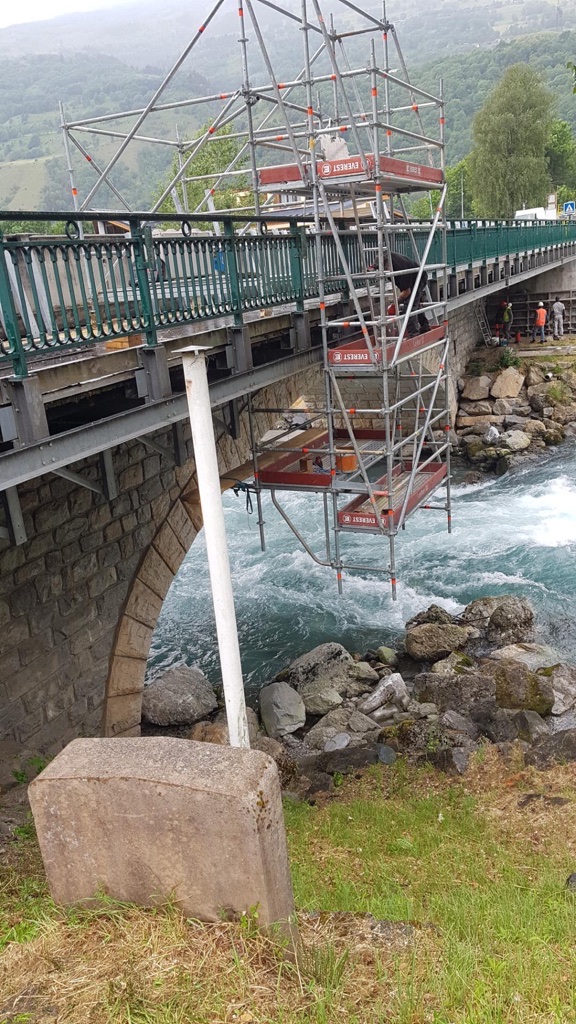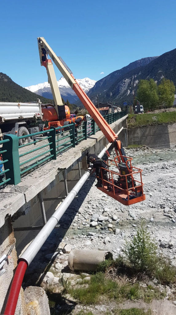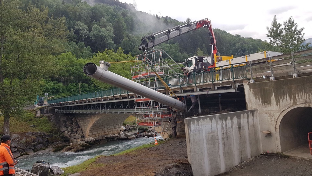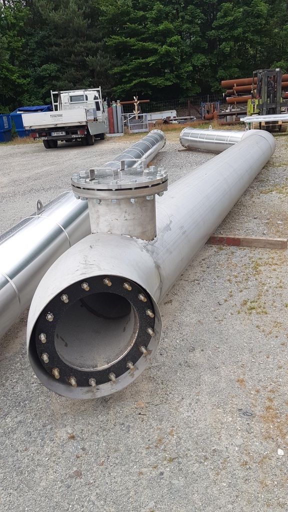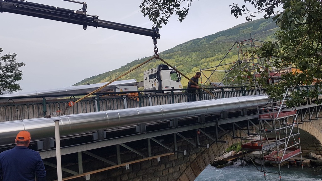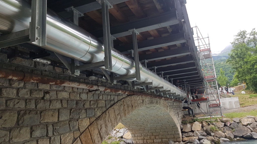 Chantier en Savoie. « Transfert de fluide » avec calorifuge sur tuyauterie DN400 Acier Inoxydable sous pont avec supportage de tous les élements.