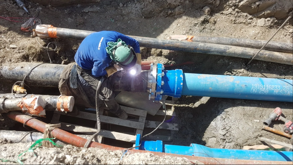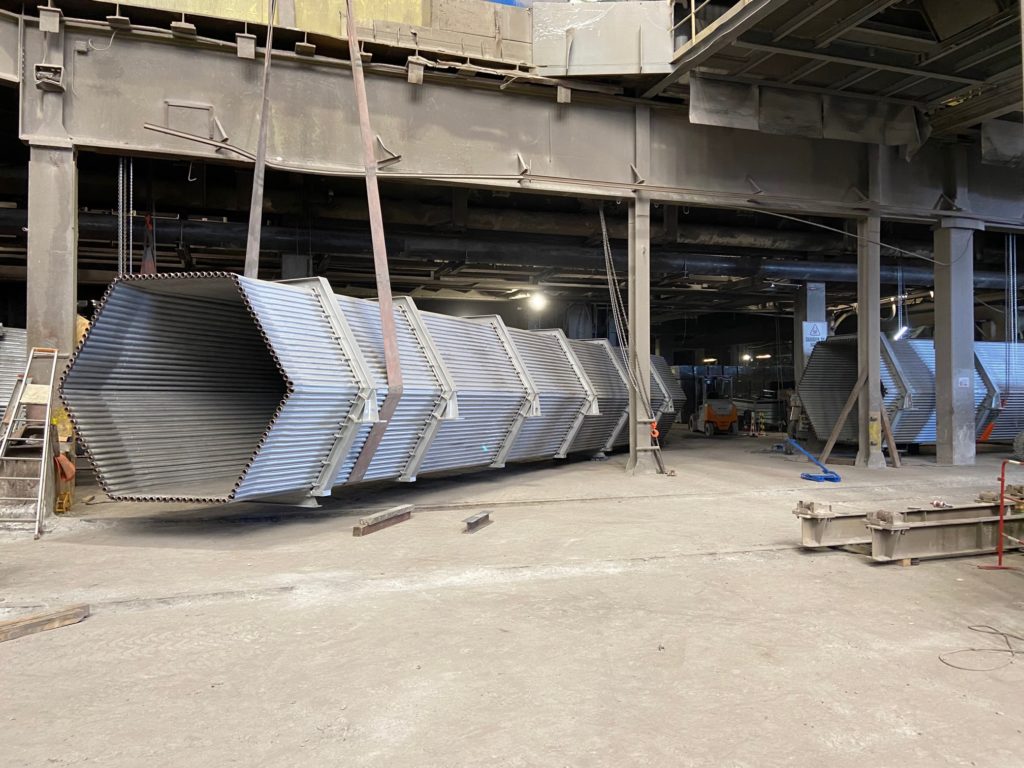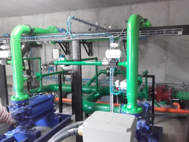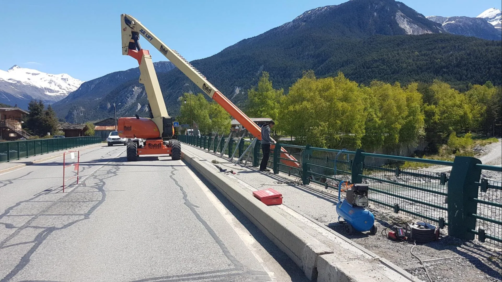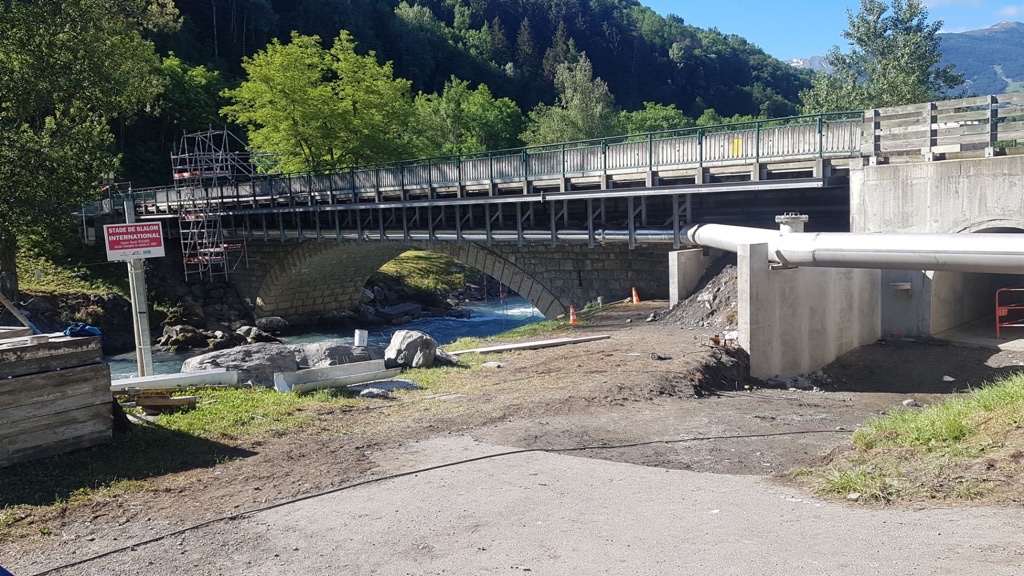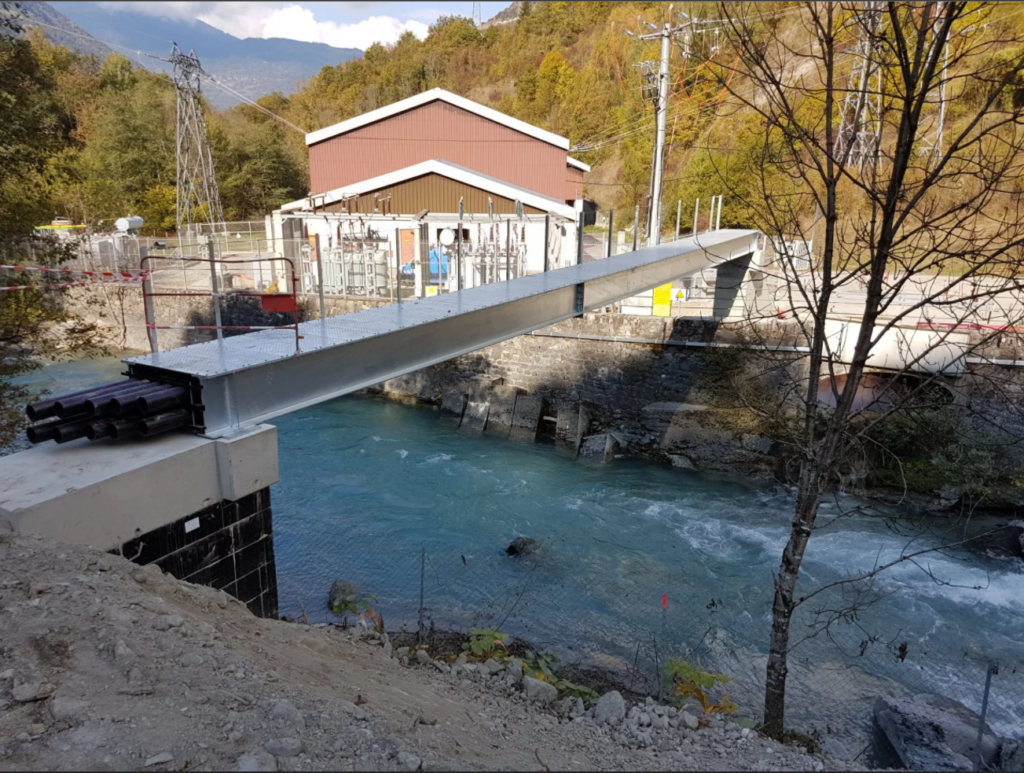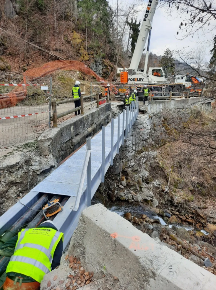 Chantier en Savoie. « Transfert de fluide » avec calorifuge sur tuyauterie DN400 Acier Inoxydable sous pont avec supportage de tous les élements.